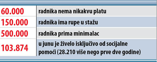 У Србији најмање 700.000 грађана располаже са мање од 75 евра месечно, а према подацима Уједињених нација тај број у последњих пет година повећава се за чак 100.000 људи годишње. Скоро 800.000, односно сваки четврти радно способан становник, нема посао. Најмање 60.000 радника нема никакву плату, око 150.000 радника има рупе у стажу, а скоро пола милиона их је на минималцу. А према последњим подацима Министарства рада, запошљавања и социјалне политике, у јуну су искључиво од социјалне помоћи живеле 103.874 породице, односно 28.210 више него пре две године.