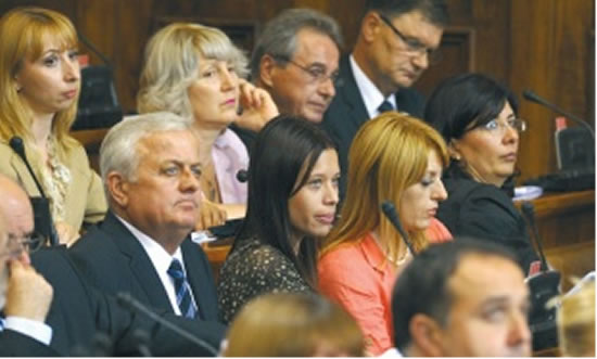 До осипања редова дошло је зато што су неке припаднице слабије заступљеног пола поднеле оставке, међутим Закон о избору народних посланика не инсистира на томе да их замени колегиница са листе, већ први слободни кандидат.Већина странака је кнап уклопила да има тачно трећину жена у својим редовима, али има и оних које нису испоштовале ову обавезу. Тако, рецимо, у посланичком клубу Јединствене Србије, који броји седам чланова, седи само једна дама. И Сања Чековић, из групе "Заједно за Србију", посланичке просторије дели са шесторицом колега. СПО нема ниједну жену у својим редовима, али су они у парламенту направили "мини коалицију" са ДХСС, који представља Олгица Батић, па су донекле извукли просек.