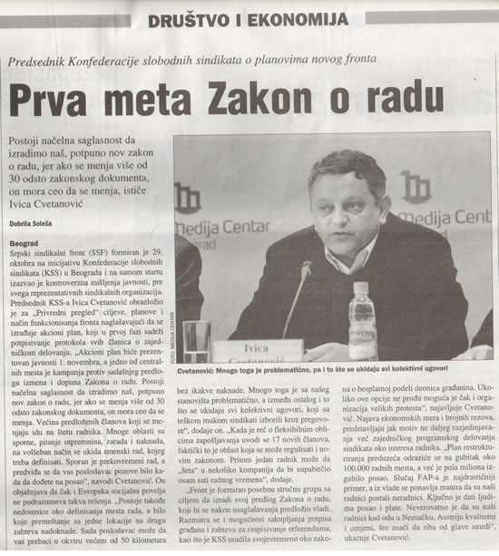 Председник Конфедерације слободних синдиката о плановима новог фронтаПРВА МЕТА ЗАКОН О РАДУ