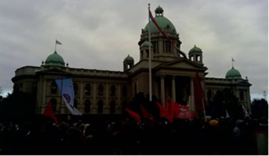 Кренули су са платоа испред Цркве Светог Марка, а нешто пре 13 часова су стигли до зграде Народне Скупштине Србије где је одржан перформанс са циљем да симболично пошаље поруку протеста јавности - "Достојанствени радници, а не робови!"