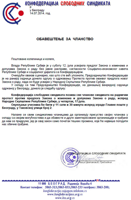 ОБАВЕШТЕЊЕ ЗА ЧЛАНСТВО