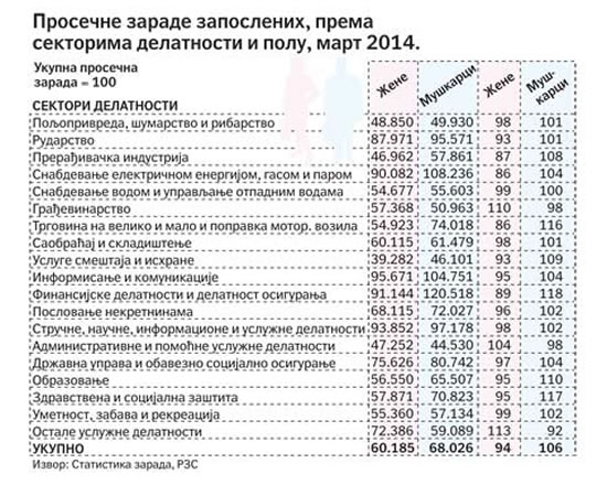 Подаци Републичког завода за статистику који су публиковани у књизи "Жене и мушкарци у Србији 2014. године" веома илустративно поткрепљују запажања наше саговорнице и сведоче да су жене, готово у свим секторима, мање плаћене од мушкараца за исти посао. Највећа разлика је у финансијском сектору и делатностима осигурања у којима плата жена, за исти посао, износи 91.144 динара, а плата мушкараца -- 120.518 динара. Парадоксално је да је чак и у сектору здравства и социјалне заштите, у којем жене чине већину запослених, плата жене у просеку мања за 15.463 динара у односу на зараду мушкарца. У сектору трговине на велико и мало платни јаз је око 20.000 динара -- на штету жена.