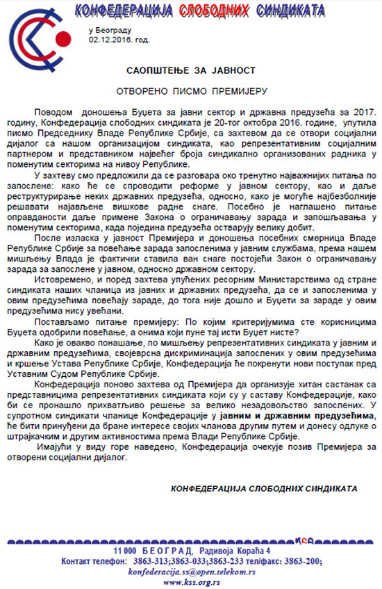САОПШТЕЊЕ ЗА ЈАВНОСТ