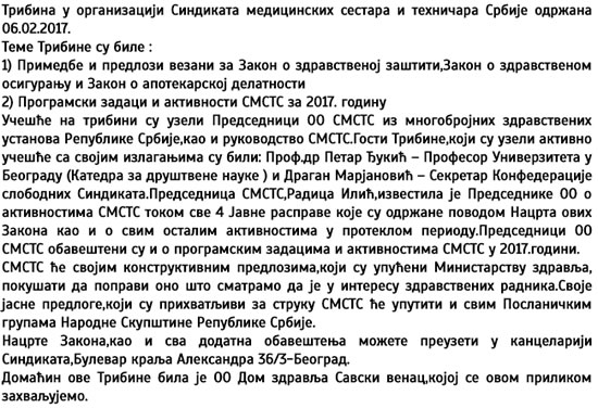 ТРИБИНА У ОРГАНИЗАЦИЈИ СИНДИКАТА МЕДИЦИНСКИХ СЕСТАРА И ТЕХНИЧАРА СРБИЈЕ ОДРЖАНА 06.02.2017. |