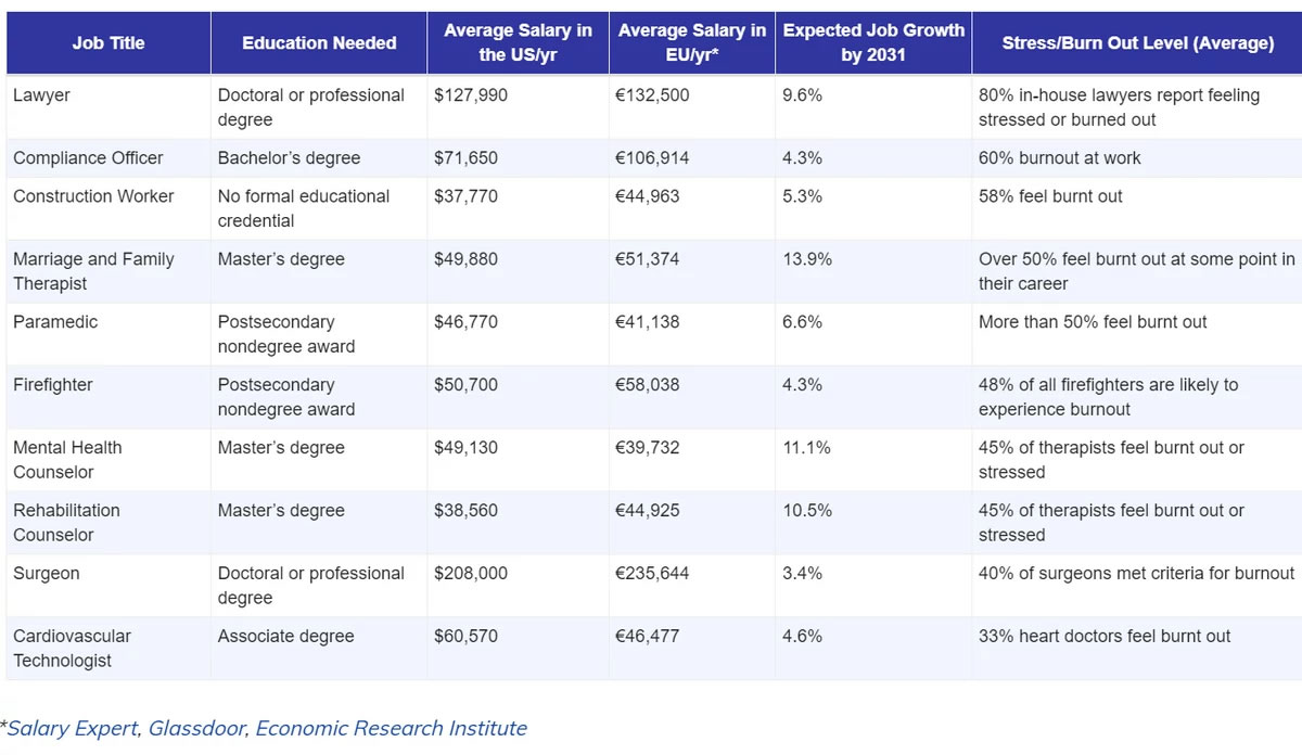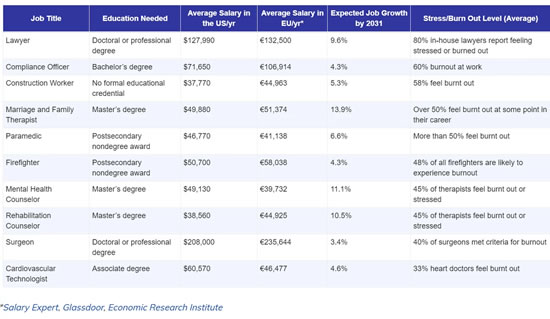 Уз њих, на листи најстреснијих послова нашли су се и терапеути који се баве менталним здрављем појединаца, саветници за рехабилитацију, али и хирурзи који су на изненађујућем претпоследњем месту. Ипак, њихова плата је у земљама ЕУ и широм Америке на убедљивом првом месту у односу на остала занимања са листе. Хирурзи ће у Европи примати просечно 235.644 евра годишње, а у САД-у 208.000 долара. Ваља напоменути и да ову професију очекује далеко најскромнији раст радних места од 3,4 одсто.