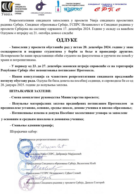 УНИЈА СИНДИКАТА ПРОСВЕТНИХ РАДНИКА СРБИЈЕ - ОДЛУКЕ О ШТРАЈКУ