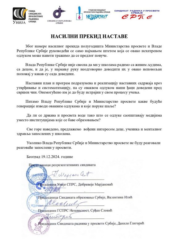 УНИЈА СИНДИКАТА ПРОСВЕТНИХ РАДНИКА - НАСИЛНИ ПРЕКИД НАСТАВЕ