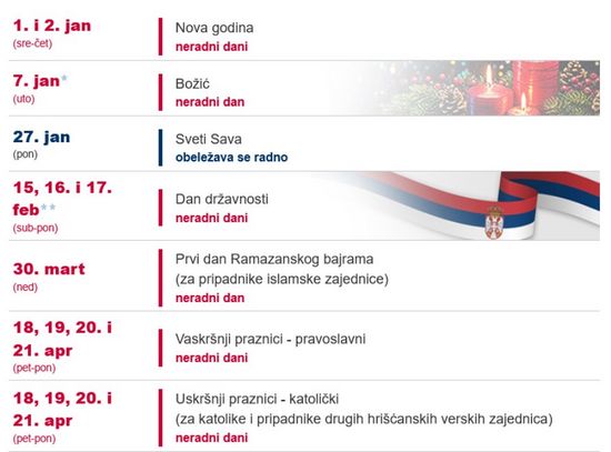 КОЈИ СУ НЕРАДНИ ДАНИ У АПРИЛУ?