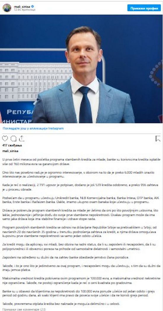 Такође, превремена отплата кредита без накнаде је могућа делимично и у целости - објавио је министар на свом Инстаграм налогу.